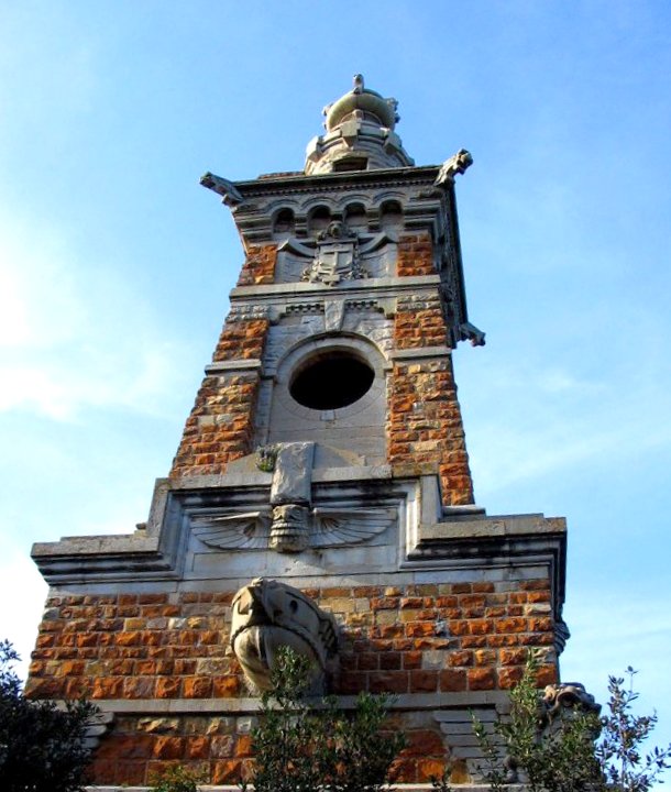La strada per arrivarci si snodava – e si snoda tuttora – tra i tornanti di una bella pineta e l’arrivo coincideva con l’improvvisa apparizione di quel torrione enorme, a forma di faro, che incuteva nei bambini, ma forse anche in qualche adulto più sensibile, una eccitante sensazione di inquietudine, con le sue decorazioni sibilline – mascheroni leonini, rostri, figure zoomorfe – la pesante cancellata in ferro battuto, gli oblò per rischiarare l’interno, l’imponente gradinata d’accesso, il gufo stilizzato che sormontava la scritta Famiglia Tonietti.