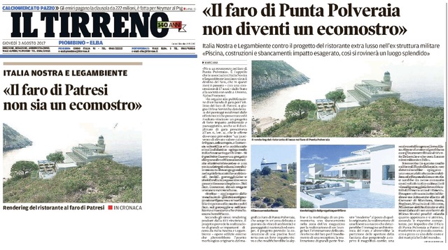 Per questo chiediamo che Comune di Marciana, Parco Nazionale, Regione Toscana, Provincia di Livorno, Ministeri dell’Ambiente e dei Beni Culturali intervengano su Difesa Servizi perché riveda quanto approvato e si attivino, secondo le rispettive competenze, per impedire che il Faro di Punta Polveraia a Patresi si trasformi in un piccolo ecomostro a picco su una delle coste e dei mari più belli del mondo.