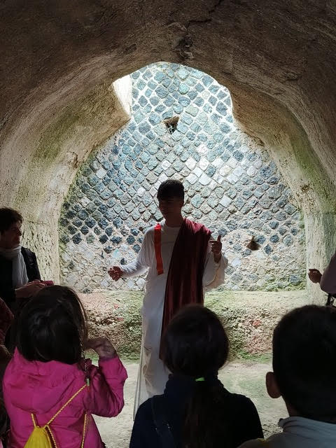 Gli ultimi a vivere questa esperienza sono stati gli alunni della Scuola Primaria di Casa del Duca dell’Istituto Comprensivo “S. Pertini”. Insieme con la Fondazione, hanno preparato un accurato lavoro in classe che si è trasformato in un’esplorazione guidata e in divertenti giochi didattici. Dal fascino del panorama alla curiosità per le minuscole tesserine di mosaico, dalla scoperta dei solidi cubilia alle storie nascoste nelle cisterne: ogni passo è stato una scoperta, fino al mistero del nome stesso delle “Grotte”.