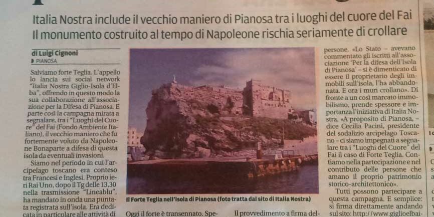 «A proposito di Pianosa, – dice Cecilia Pacini, presidente del sodalizio arcipelago Toscano – ci siamo impegnati a segnalare tra i Luoghi del Cuore” del Fai il caso di Forte Teglia. Contiamo nella partecipazione e nel contributo delle persone che amano il proprio patrimonio storico-architettonico».